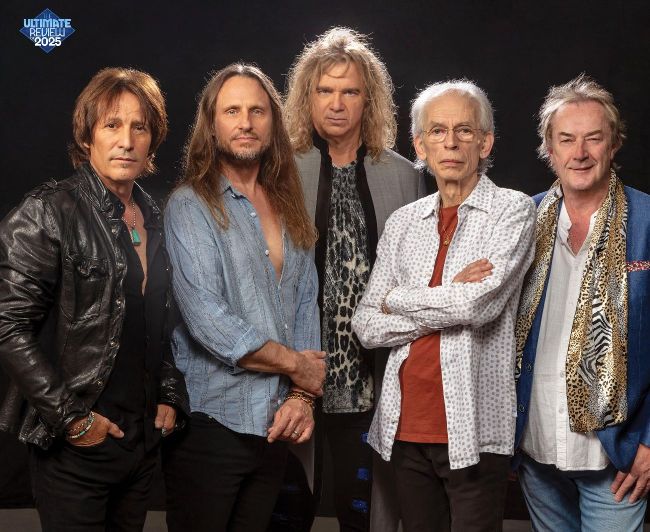 Yes, L-R: Jay Schellen, Jon Davison, Billy Sherwood, Steve Howe, Geoff Downes.