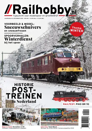 Railhobby 454 Railhobby 454 staat in het teken van de winter. Voor een Reportage reizen we mee met de stoomsneeuwfrees R 12. In Uitgelicht lichten we sneeuwruimers, -ploegen en -frezen van diverse fabrikanten uit. Bij de spoorwegen wordt het spannend als de temperatuur onder het vriespunt daalt. Speciale draaiboeken komen dan uit de kast. We bespreken de verschillende wintermaatregelen. In Baan in beeld bekijken we een winterdiorama. In Historie gaan we in de op geschiedenis van de posttrein in Nederland. In mei 1997 vond het laatste postvervoer per binnenlandse posttrein plaats. Daarmee eindigde een traditie die ongeveer zo oud was als de trein zelf. Op 12 november was de finale van De Grote Kleine Treinencompetitie, seizoen 2. We interviewen de winnaar, Team Blauw, en blikken met hen terug op de wedstrijd. Hoe weten we hoe snel de trein rijdt of wat de minimumsnelheid van een locomotief is? Modelbouwer Rob gaat met een handig hulpmiddel, de speedometer, aan de slag. In Railhobby 453 bespraken we het eerste deel van de inzendingen van de A6-dioramawedstrijd. In deze uitgave passeren de andere diorama’s de revue. In een Railtest nemen we de DB BR 93 in H0 van Piko onder de loep.