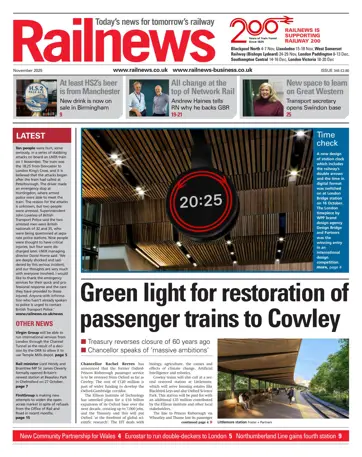 November 2025 The November edition of Railnews leads with the news that a passenger service is to be restored on the former Oxford-Princes Risborough line as far as Cowley, with two stations at Littlemore and Cowley. Tomorrow’s railway has been taking shape in other ways. Rail minister Lord Hendy and Braintree MP Sir James Cleverly opened Britain’s newest station at Beaulieu Park in north Chelmsford on 27 October, only a few days after the fourth Northumberland line station had opened at Blyth Bebside. Double decker trains are set to be running to London six years from now, because Eurostar has ordered 30 Alstom sets and has an option for 20 more. In related news, the RMT is to hold a strike ballot at Eurostar in a dispute over working conditions. Virgin Group could be able to run Channel Tunnel trains following a decision by the ORR to allow it to use Temple Mills depot, although there are still hurdles to be crossed, and another glimpse into the future was provided by a new design of clock unveiled at London Bridge. An electric train has run under test on the East Kilbride line for the first time, construction of 10 more Elizabeth line trains has begun at Alstom in Derby, and Northern recorded its busiest month since before the pandemic, with more than 8.1 million journeys made. The transport secretary opened Great Western Railway’s new Learning and Development Centre at its Swindon head office on 24 October. We also hear from outgoing Network Rail CEO Andrew Haines, who is welcoming the newly unified Great British Railways. Finally, we were closing for press when news broke about the tragic stabbings on board an LNER train, and we were able to include some early details on the front page. Railnews for November is out now.