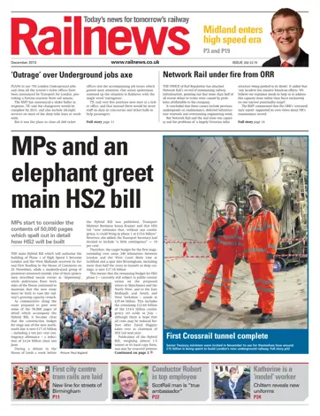 The last edition of Railnews for 2013 leads with a key development for the railway industry, when the House of Commons gave the First Reading to the main Hybrid Bill which will authorise Phase 1 of HS2. But the closing weeks of the year are seeing other major developments too. The first 125mph running starts in December on the Midland Main Line and we have the details, along with a special Guest Opinion from East Midlands Trains managing director David Horne. There is controversy brewing on London Underground, after Transport for London announced that it intends to close all ticket offices by 2015, as well as introduce the first all-night tube services. We report reactions to this, and our feature this month also goes Underground, to take a wider view of the network’s past, present and future. In other news, Network Rail has been under fire from the ORR over performance, the details of the next ScotRail franchise have been published, Peterborough gears up for a major Christmas blockade and the first European Rail Congress, held in London, has given an award to a Belgian high speed scheme which could see trains from London calling at Brussels Airport. Our railway creature theme continues, too. After seagulls and peacocks, now it’s the turn of guide dogs. How are they connected with Caledonian Sleepers? The answer is in Railnews for December.