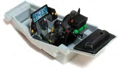 The instrument panel decal is larger than the panel’s recess and clear acetate cover, so it needs to be applied over them rather than between them. This is a view of the finished cockpit prior to installation. Since this was built, Eduard’s colour etch sets have become available