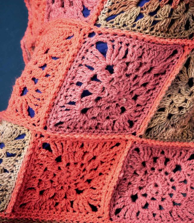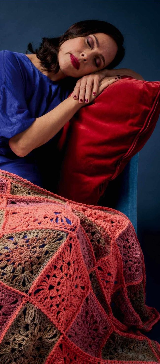 While the day away under this weightless yet warm motif blanket. The single-colour squares really set off the antique-looking tones of the yarn.