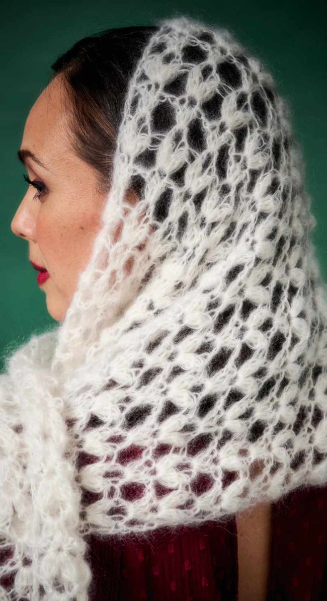 This featherweight shawl will feel like the softest touch on your neck and shoulders, and will look incomprably beautiful hooked in the whitest white.