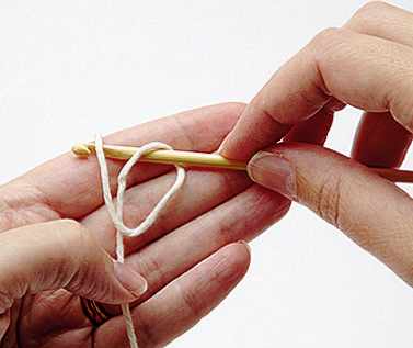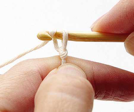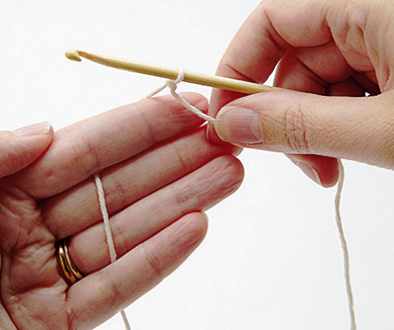 1 Hold the hook in your right hand, and both the yarn end and the working yarn in your left hand. Move the hook under and over the yarn to wrap it around anticlockwise.