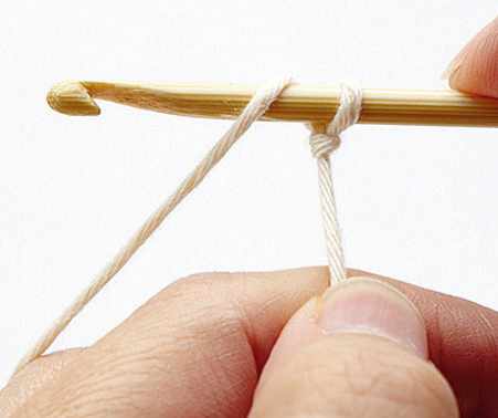 4 Pull both ends of the yarn to tighten the knot, then pull just the ball end to tighten the loop so it’s close to the hook, but not touching it.