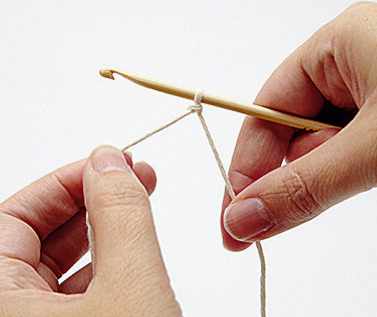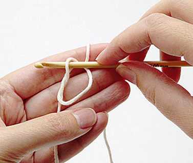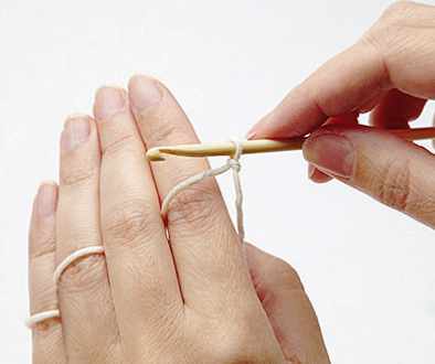 1 Hold the hook in your right hand, and both the yarn end and the working yarn in your left hand. Move the hook under and over the yarn to wrap it around anticlockwise.