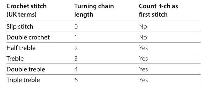 Understanding turning chains is vital to being able to create crochet fabrics with the right shape. The height of the stitch you’re working on the next row or round will determine the number of chains you need. The table on the right shows you how many chains you need in your turning chain for each of the different stitches. The extra column will be explained opposite. Read on and I’ll answer more of your turning chain questions…