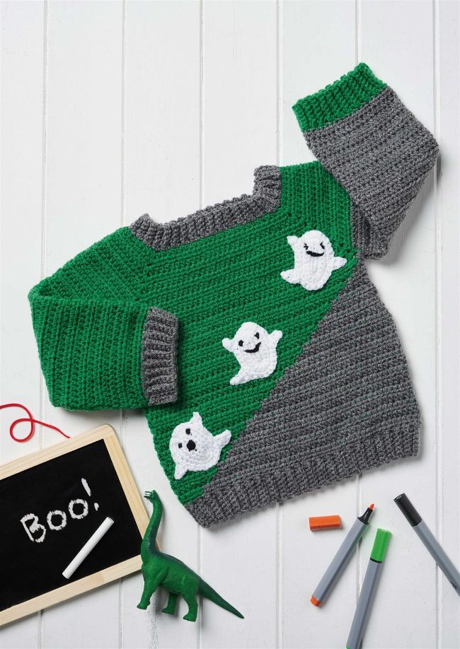 Keep a little one warm, whether they’re trick-or-treating or at a party, with a festive ghostly jumper that’s as sweet as candy.