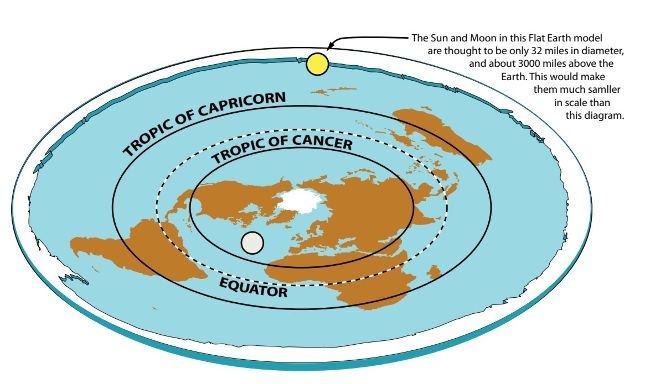 The contemporary Flat Earth Society imagines a flat disk surrounded by an ice wall to keep the oceans in place. A tiny spotlight-like Sun moves back and forth from the Tropic of Cancer to the Tropic of Capricorn to create the seasons. Referenced from the Flat Earth Society website: