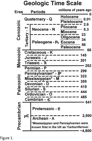 Most young-Earth creationists believe that the sediments deposited by this flood were deposited over Earth’s globe and constitute a large portion of the geologic record beginning in the Cambrian Period in the Paleozoic Era to at least the end of the Cretaceous Period in the Mesozoic Era. They believe that all sedimentary rocks younger than this time from the Paleocene to the present (Holocene at the top of the time scale) were deposited after the flood (Hill et al. 2016). In the time scale shown in Figure 1, 6,000 years would hardly be the thickness of a sharp pencil line at the very top of the image. Therefore, the YECs condense the extent of animal and plant generations to an extremely tiny fraction of the length of this image. As I demonstrate, such a belief requires abandoning large portions of scientific consensus and common sense, but a recent Gallup poll2 of the adult population in the United States indicates that nearly half of the people in this country (46 percent) believe what young-Earth creationists claim is the literal biblical time frame. (A more recent Gallup poll3 indicates that 38 percent of the adult population believes that humans were created by God in their present form but that a very young age for the origin of Earth is roughly 10,000 years.) However, in this article it is assumed that the very long ages indicated in Figure 1 are valid.