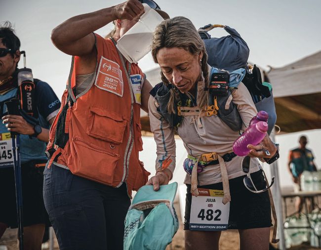 Julia Ebbrell at an aid station on the Marathon des Sables ultra route