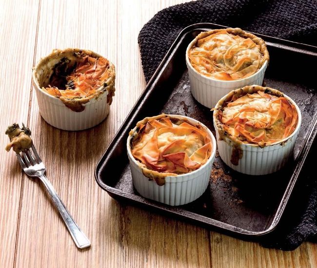 These tasty little pies are super easy to make and take very little time to prepare and cook. They are made using filo pastry instead of thick shortcrust or puf pastry, which reduces the Fat content.