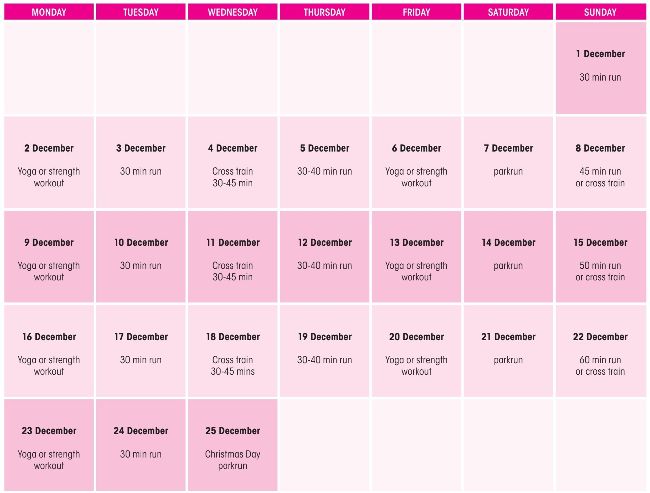 A training plan to help you stay active throughout December until Christmas, wiTha mixture of parkruns, cross training, yoga/strengThwork and easy runs, to keep you motivated this winter
