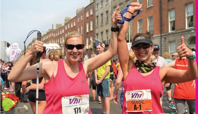 First place visually impaired runner Sinead Kane, left, with her guide Sinead Desmond after completing the 2016 Vhi Women’s Mini Marathon in Dublin