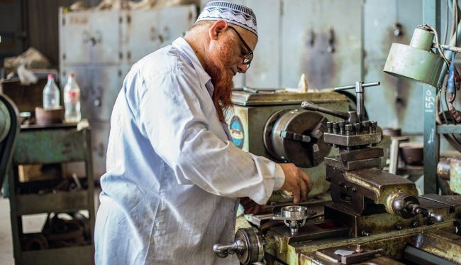Think about the appearance and character of the man. What qualities might you ascribe to him? How might you convey that in words? Next, do the same for the machine. Now, write a piece of prose or poetry about the man and his relationship to the machine he’s working on.